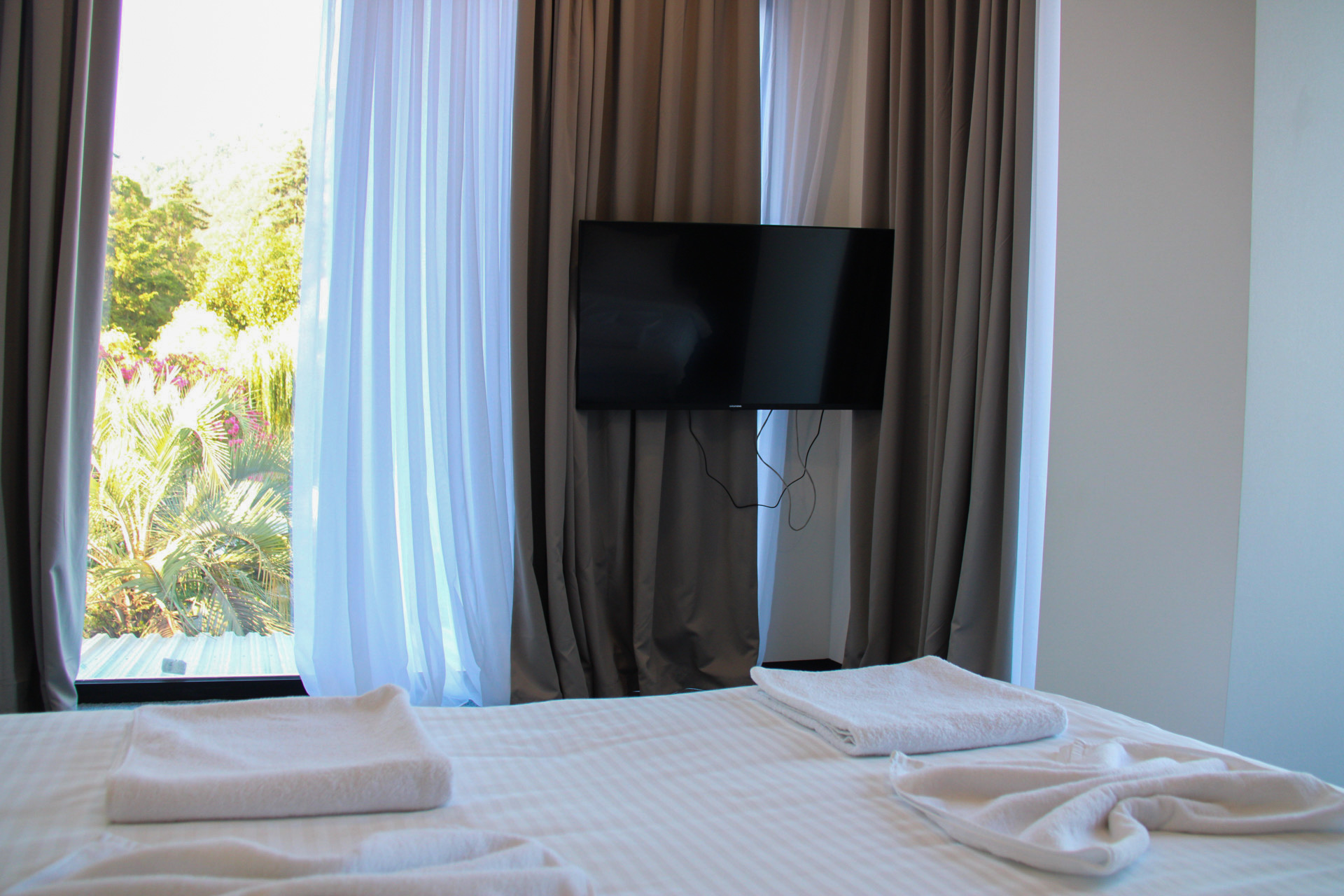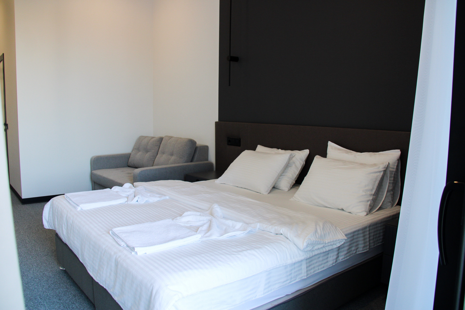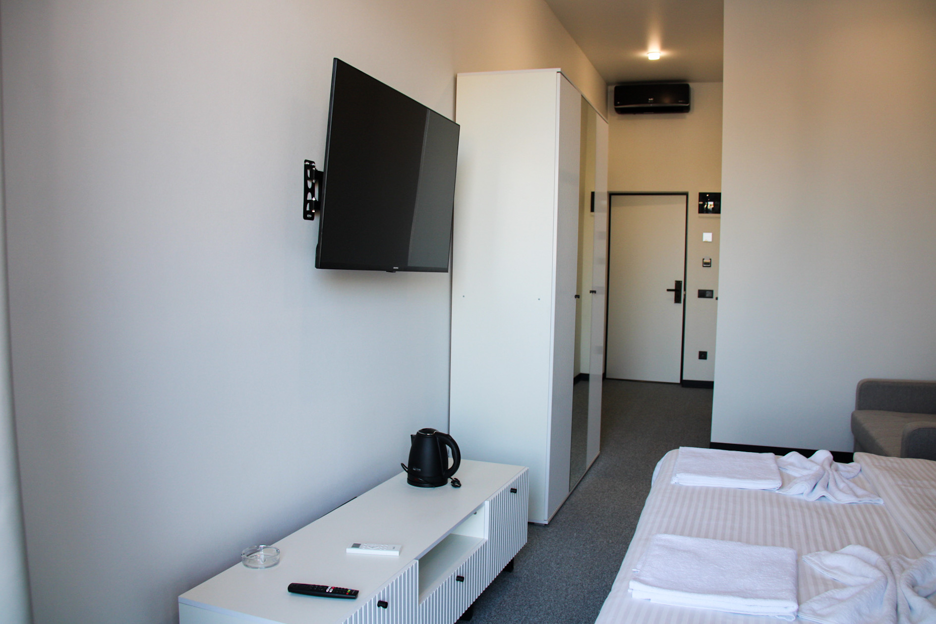Однокомнатный номер предлагает гостям спальню с двуспальной кроватью и раскладным мини-диваном, санузел с душем. Из удобств кондиционер, телевизор, чайно-кофейный набор, туалетные принадлежности.