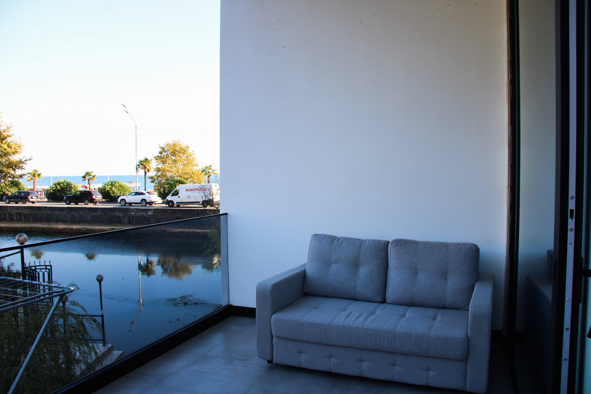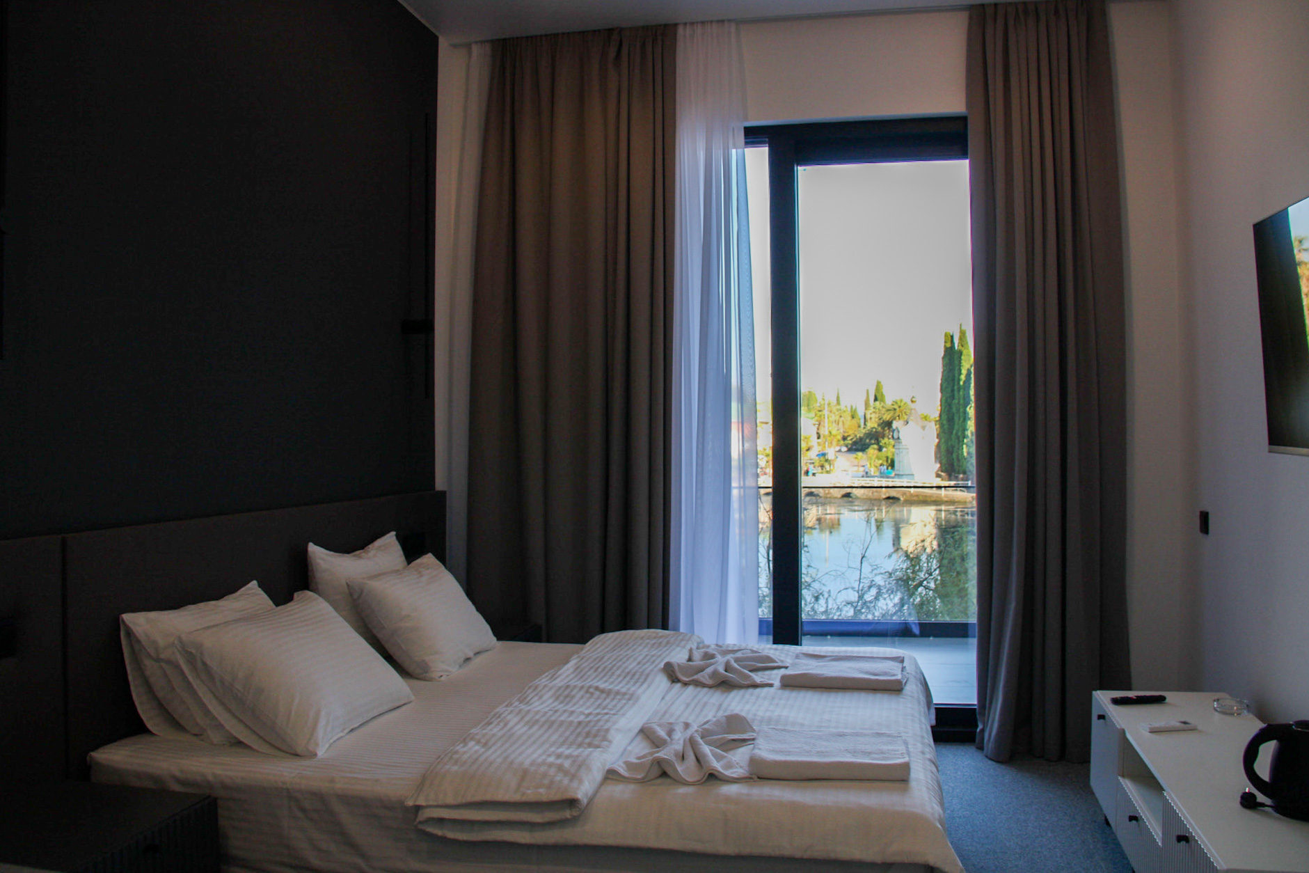 Комфортабельный номер располагает балконом с видом на море и озеро, спальней, ванной комнатой с душем. В комплектации кондиционер, чайно-кофейный набор, туалетные принадлежности. Для размещения предлагаются двуспальная кровать и раскладной мини-диван.