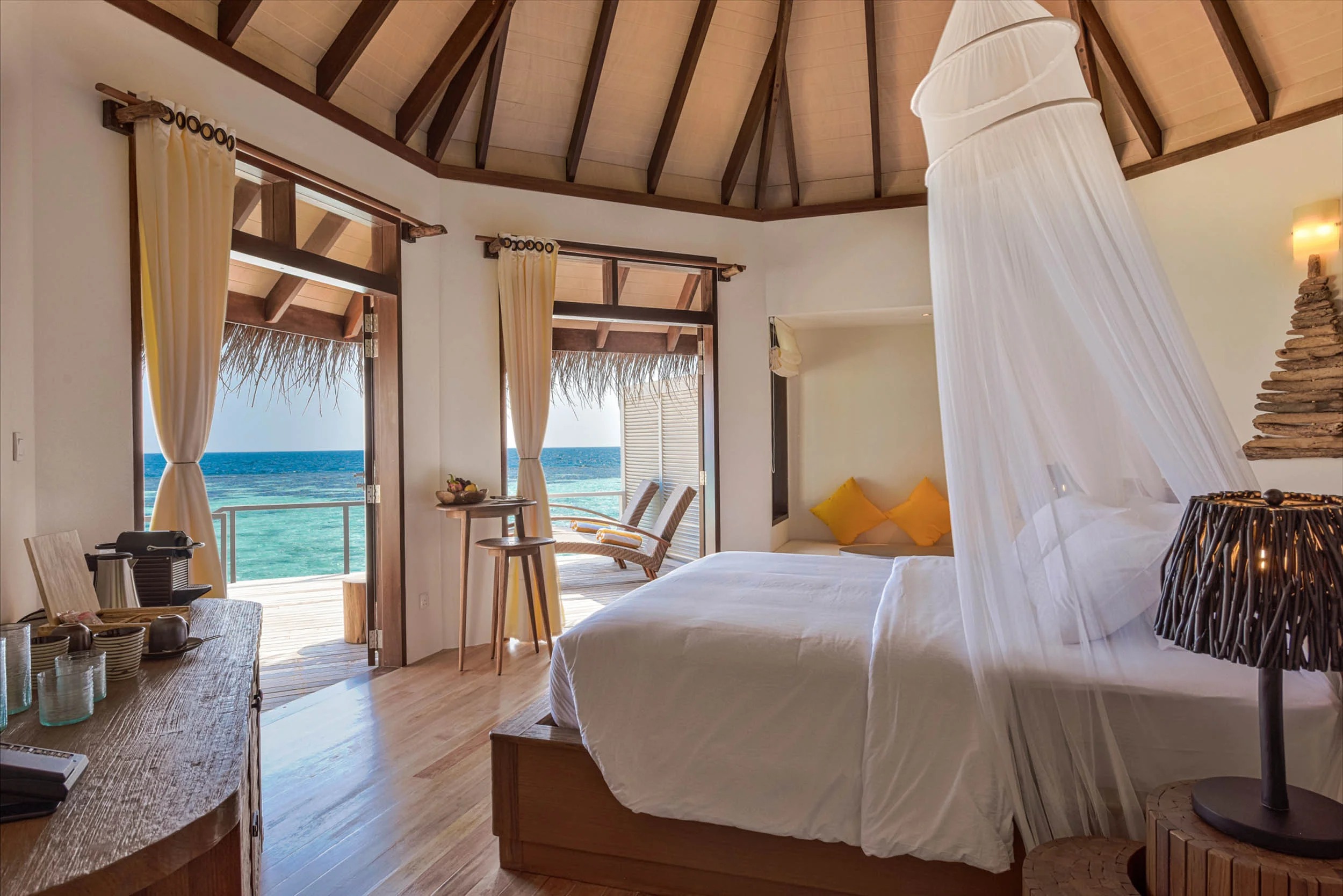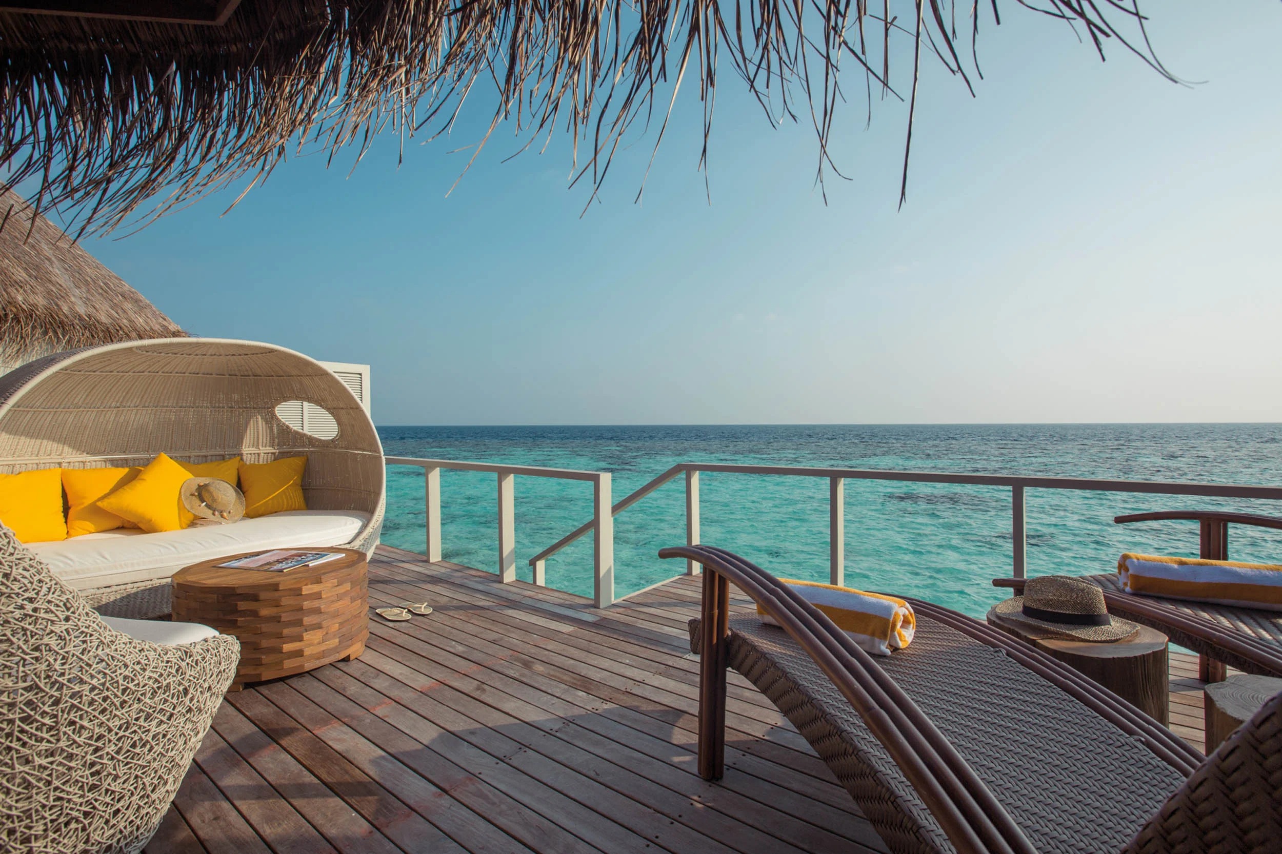 Уютная вилла на сваях над водой с меблированной террасой и спуском к океану. В комплектации кондиционер, сейф, мини-бар, чайный набор, Wi-Fi, фен, туалетно-гигиенические принадлежности. В номере санузел с ванной и душем.